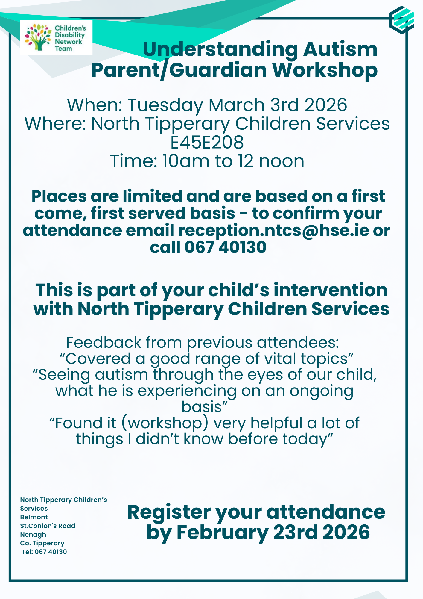 North Tipperary CDNT are running a workshop on Understanding Autism which is open to those on our waiting list – Click Here