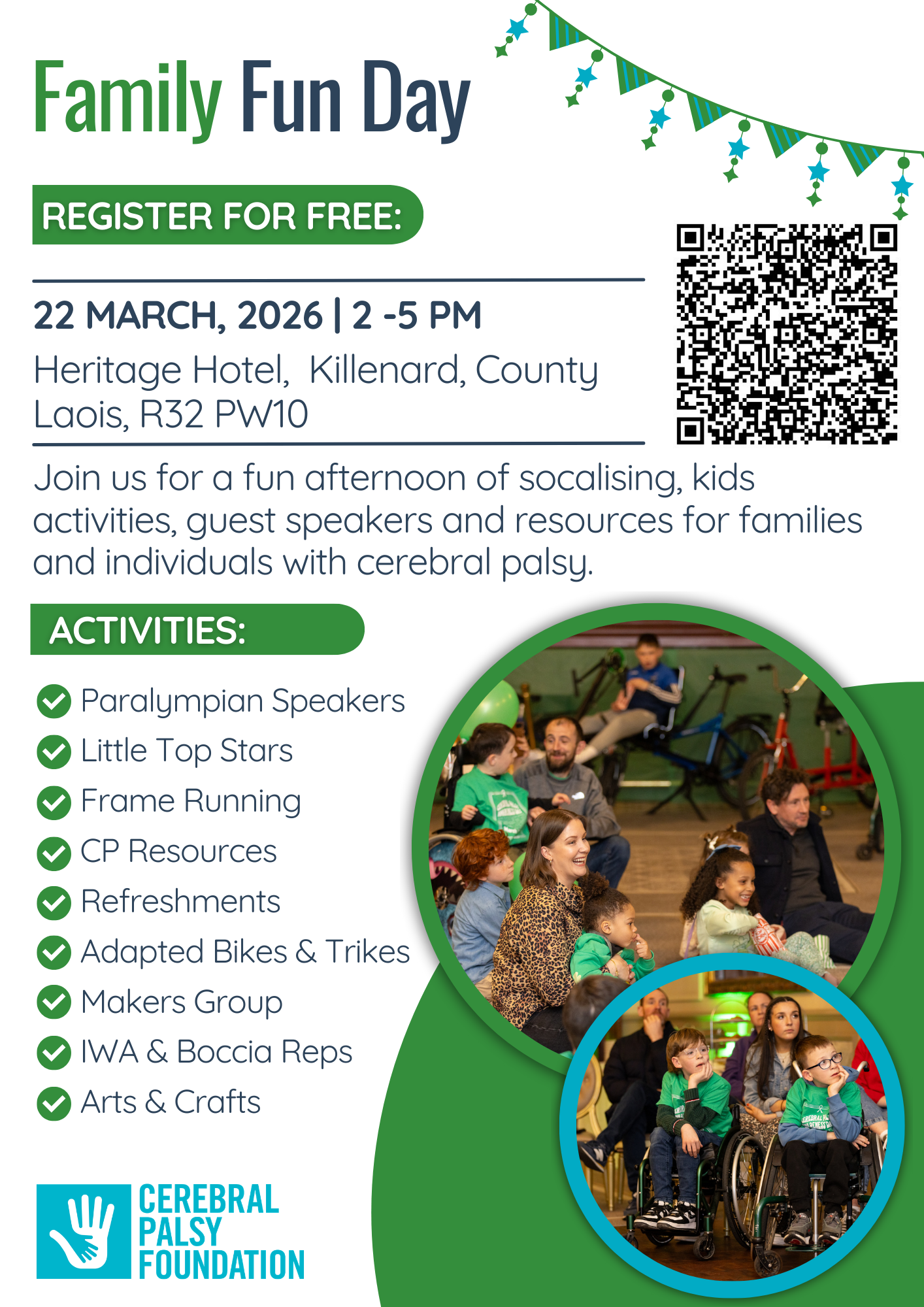 Cerebral Palsy Foundation is inviting children with CP and their families to a FREE Family Fun Day at The Heritage Hotel, Killenard, Laois. Poster Here