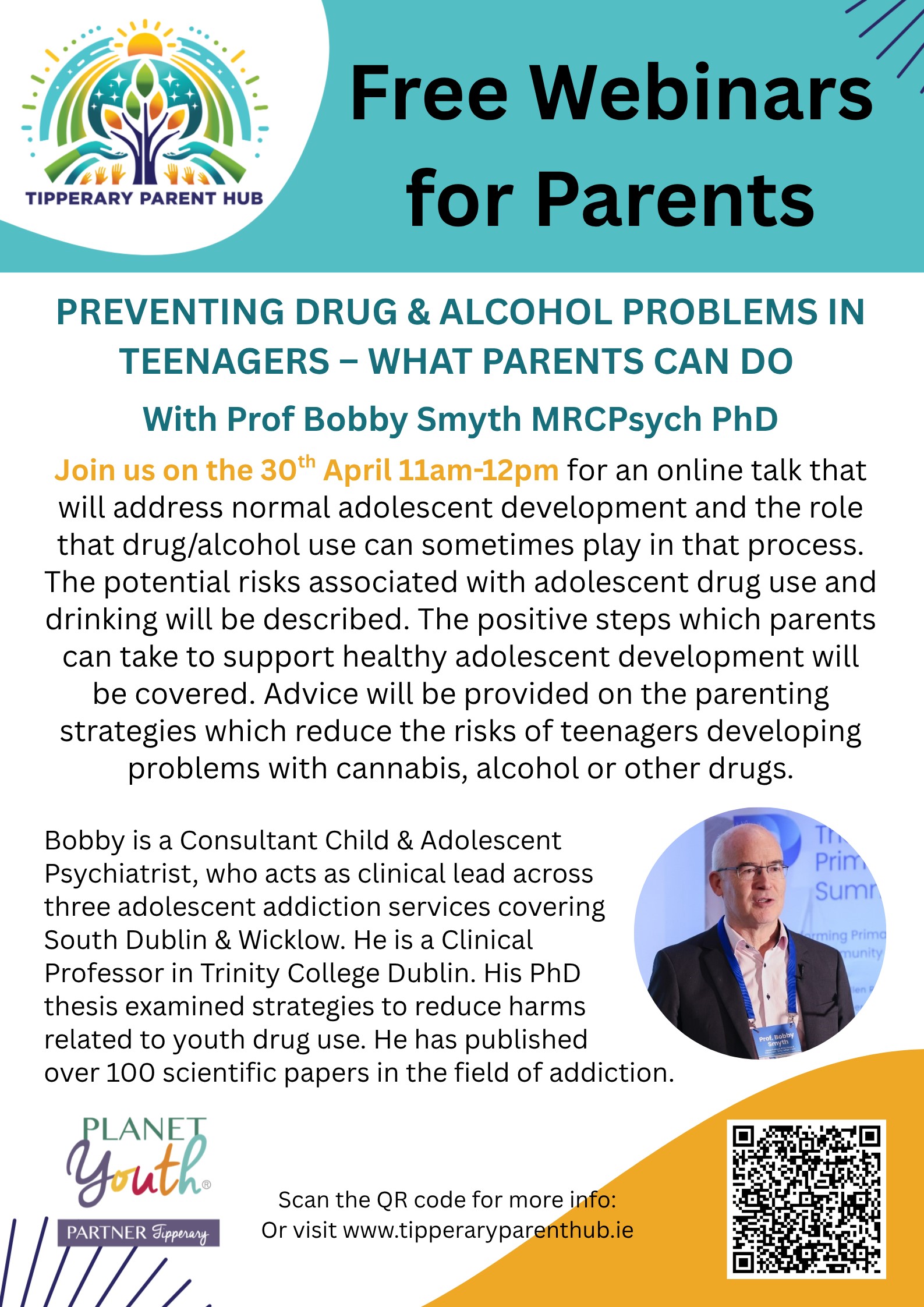 Tipperary Parent Hub webinar Preventing Drug and Alcohol problems in Teenagers – What Can Parents Do, with Professor Bobby Smyth MRCPsych PhD. Thursday 30th April, 11am-12pm.